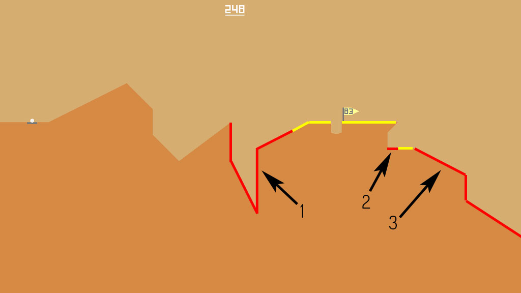 Desert Golfing is a 2D game where you golf in the desert – sorry, but that’s really the only way to describe it. There have been countless 2D and 3D golf games on mobile phones, and on the surface Desert Golfing is just a simpler, less polished game. The graphics are nothing more than a ball, sand, and a flag (though there are rumors of cacti in later levels). You hit the ball by sliding your finger back to adjust for power and angle. If that sounds familiar, you’ve probably played a game on a Smartphone in the last eight years – it’s an extremely common mechanic. Each hole is a single screen, and completing a hole moves you on to the next one. Since you’re playing in the desert, all the ground is sand – it can be difficult to judge how a ball will roll or move along the rough turf, adding to the challenge. You’ll learn it fairly soon, but it’s important to remember the ball will not move as one would assume.