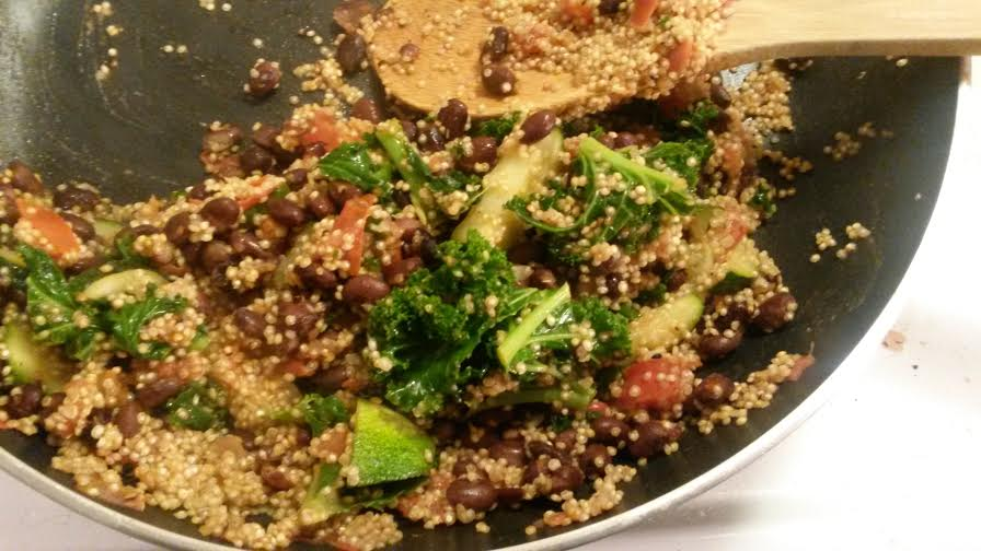 3. In a large skillet, heat the oil over medium heat. Add the zucchini, kale, tomato, beans, and spices. Let simmer under the kale has shrunk. Stir in the tomato paste and cook for one minute. Stir in the quinoa and remove the pan from the heat.