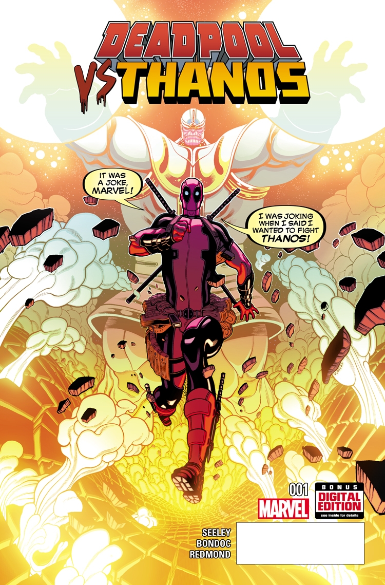 New York, NY—August 5th, 2015 — Yes, you heard correctly dear reader! The fight of the century is upon you, and the Merc With a Mouth is set to go toe-to-toe against the Titan With a Temper in September’s DEADPOOL VS. THANOS #1! Writer Tim Seeley and artist Elmo Bondoc, along with cover artist Tradd Moore bring you a high-octane thrill ride starring two unlikely adversaries!