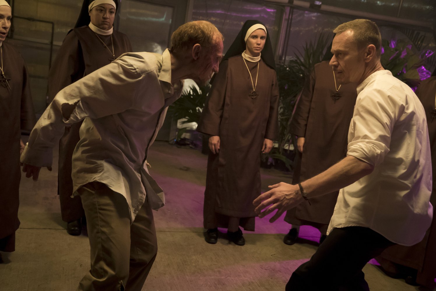 The really compelling story is Marcus’, as he flounders about Chicago in his new defrocked state. Following the names on the back of his bus ticket, he first finds himself at a convent run by Mother Bernadette (Deanna Dunagan). Seems the nuns are running something akin to exorcisms of their own, where they surround a possessed homeless man and patiently invoke the name of the Virgin Mary even as it lashes out at Bernadette. At this point, The Exorcist illustrates the kind of tough maternal love for a child. Bernadette suggests that Marcus “use a feminine touch,” but what she really means is: be willing to get your hands dirty for God’s children. The possessed man is violent, and he strikes Bernadette repeatedly (she has the scars to show it), but she presses on not in repaying violence with violence, but with love which endures the hurt.