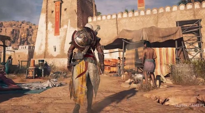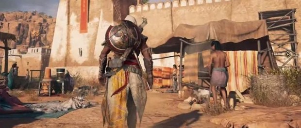 Next, let’s talk combat. There did seem to be some minor issues with it here and there in the gameplay demo, but all in all it looked impressive. The devs showed off multiple tactics, use of the shield (a totally new addition to the Assassin arsenal), and what appeared to be a more responsive combat system, as well as a “less-scripted” form of encounter. The main fight that we saw in the gameplay demo was also almost reminiscent of the Dark Souls games, as Bayek went up against a guard who was quite a bit larger than the proto-Assassin himself, making it so our protagonist had to rely heavily on evasion and picking the right time to strike.