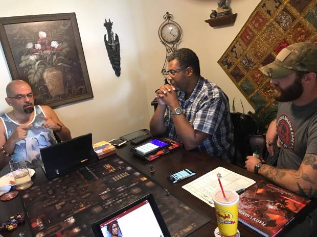 Joel our DM (left) explaining a setup question to Alex (center) and Dan (right)